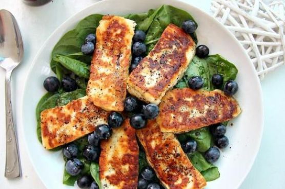 Place the spinach in a bowl, put the Halloumi cheese pieces on top of the spinach.