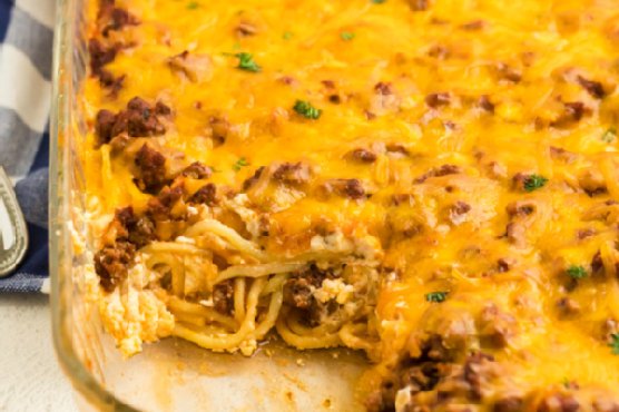 Pour the meat sauce mixture over the spaghetti.