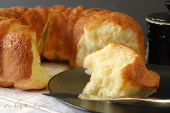 Cut into walnut-sized squares and dip each into melted butter, then pile in fluted tube pan.