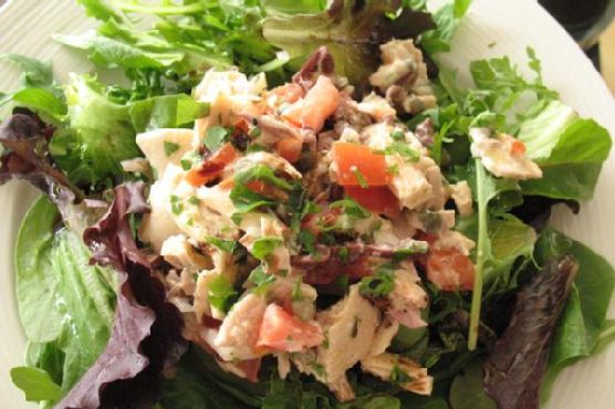 Serve on a bed of mixed salad, tossed with olive oil and red balsamic vinaigrette. The ratio for the vinaigrette is 1 part vinegar to 3 parts oil.