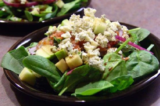 Plate two generous servings of baby spinach.Top each salad with onion, apple, bacon and bleu cheese.